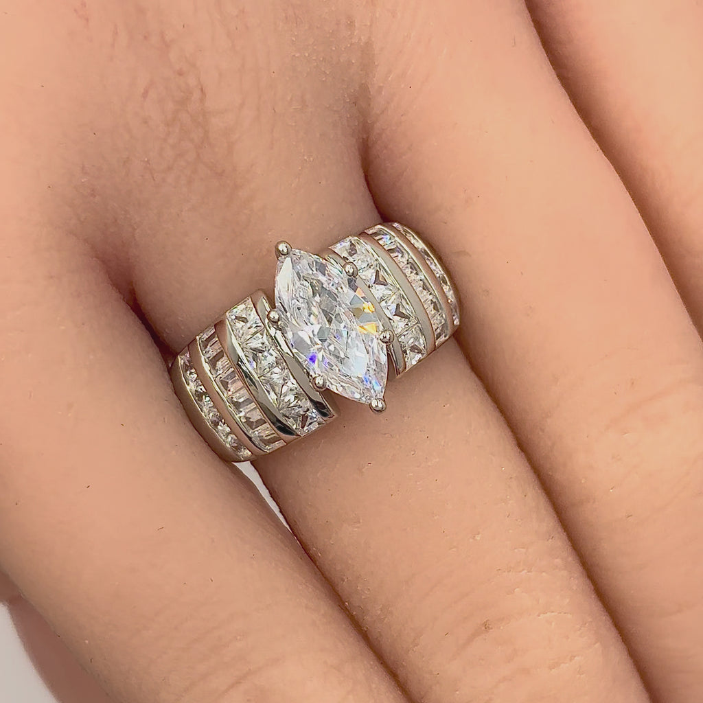 - Stone shape: marquise (center), round, princess & baguette cut